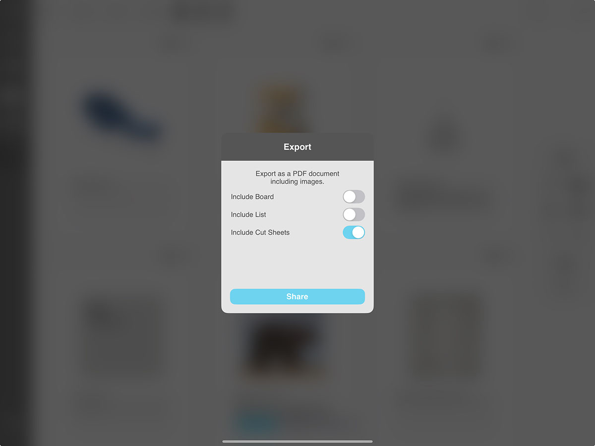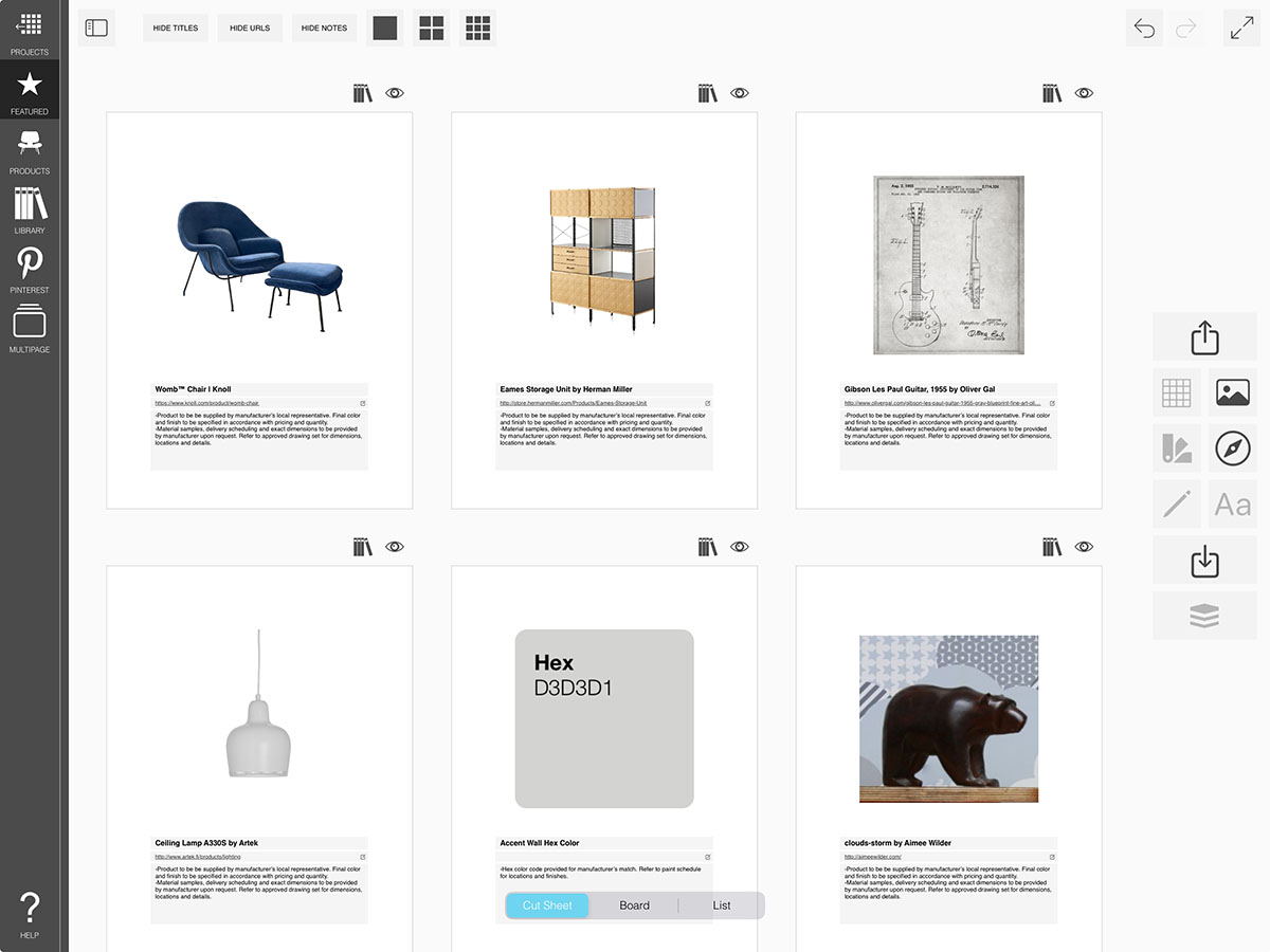 Remember that while you're busy creating a beautiful moodboard or creative collage, Morpholio Board is working behind the scenes to make cut sheets for each product on your board. When you're ready, you can share your cut sheets as a PDF with any collaborator or client.