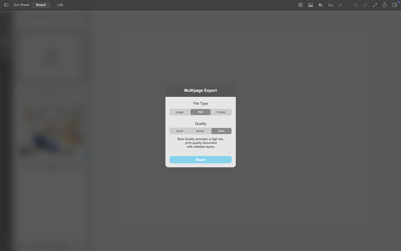 You can choose to export your boards as separate image files, a single PDF, or a project file with all your pages.