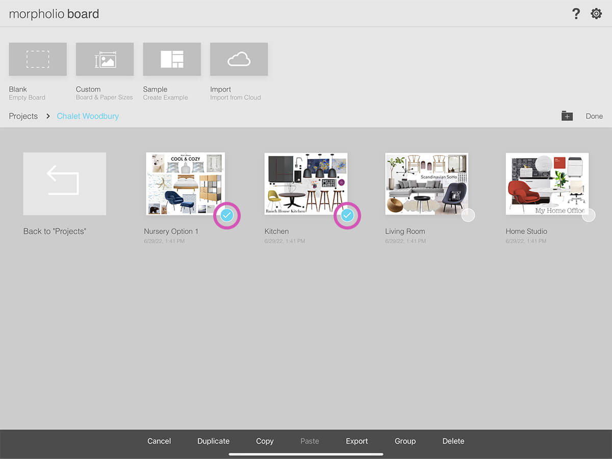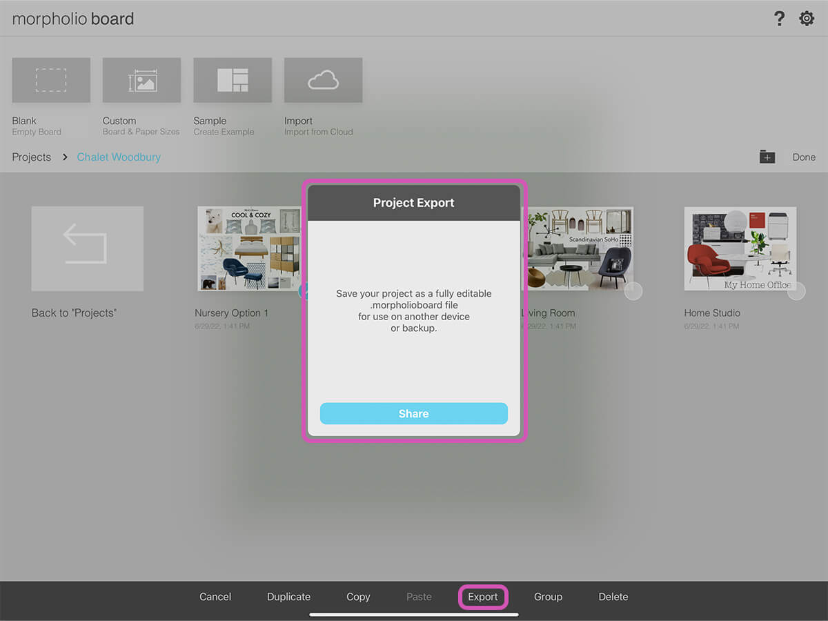 Did you know you can effortlessly share all of your original Morpholio Board projects? Want to send a moodboard to your team back at the office, AirDrop it onto your iPhone for a quick client meeting or simply save it to your cloud storage for better organization? Below is a quick "How To" guide to get you started sharing and backing up your work.