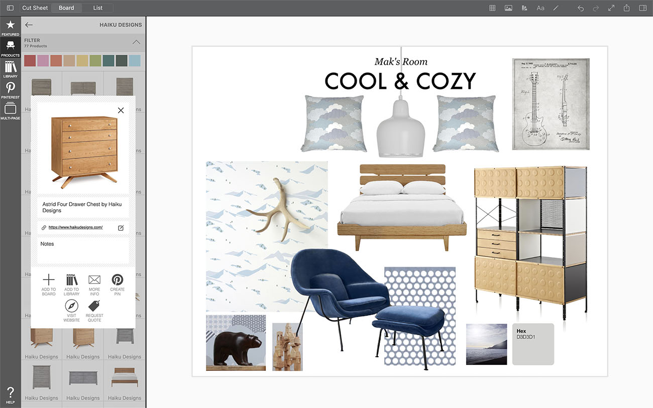 A key benefit of storing your products in your personal library is that all of the notes that you've added in the Cut Sheets and Lists view for your product will be attached to the product when you add it to another board!