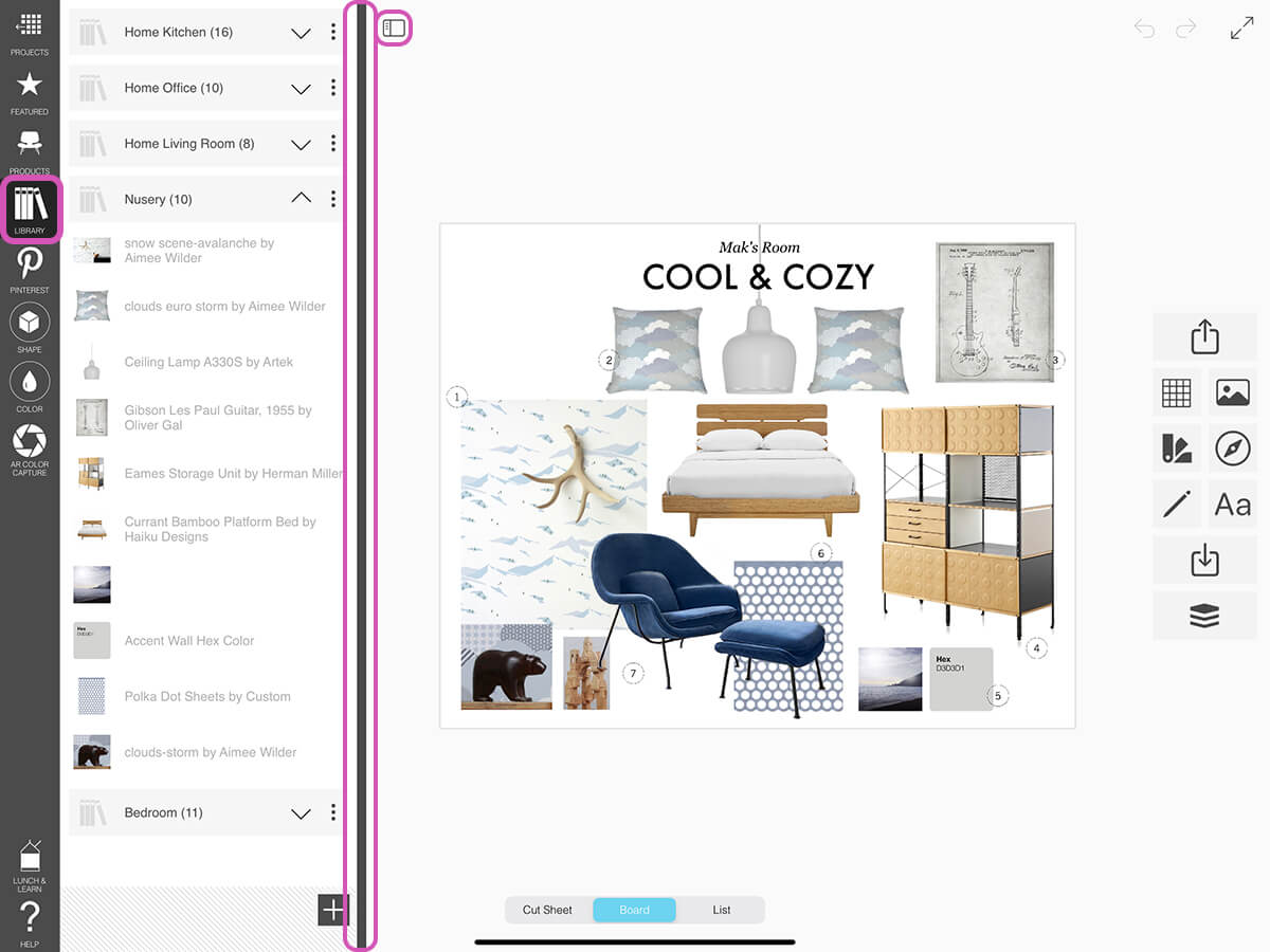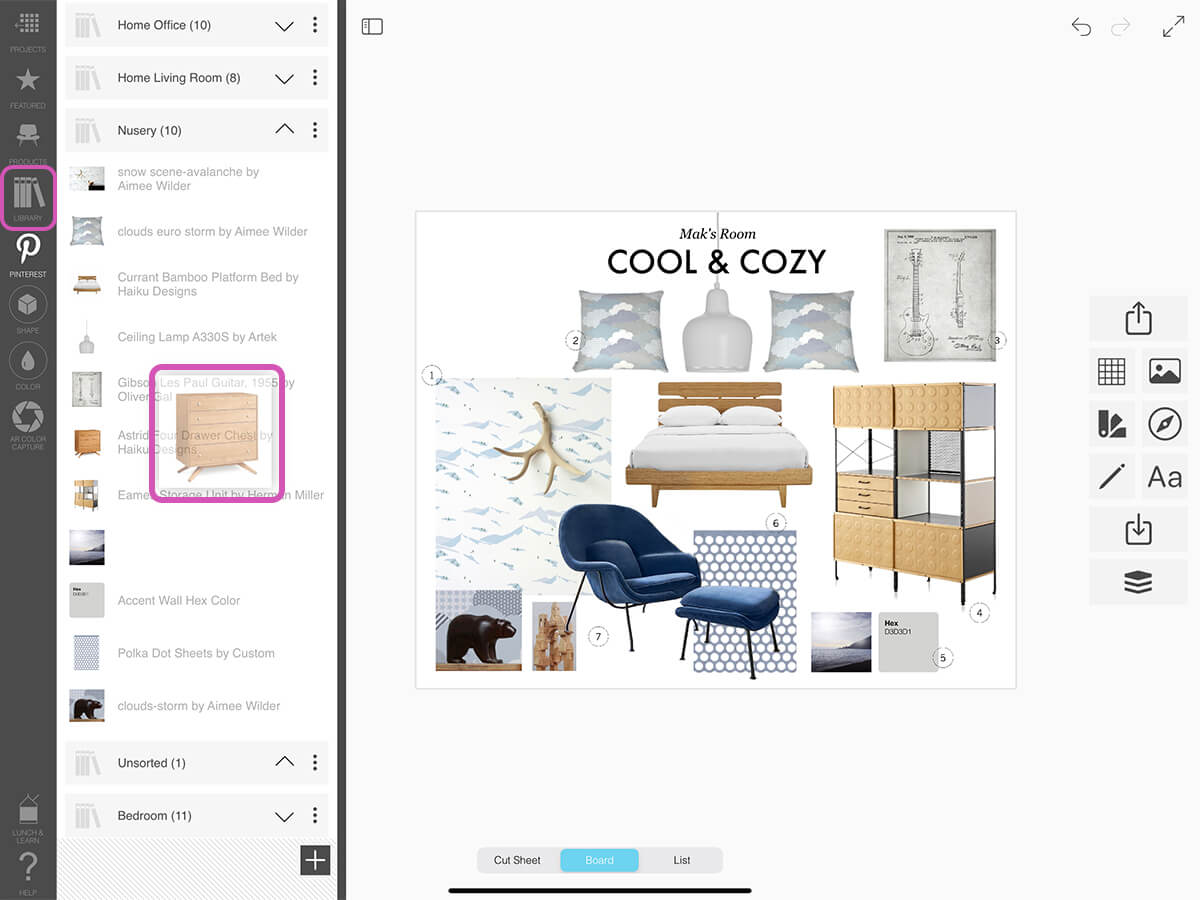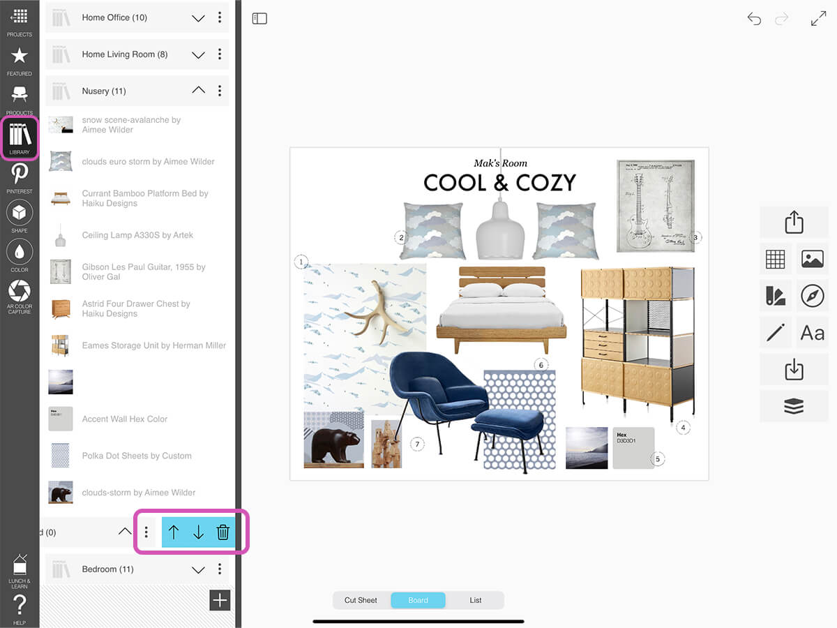 To save products from your board to your personal library, press and hold them until they pop up. Then, drag them into the library folder that you want to add them to. Alternatively, you can tap the Add to Library button in Super Tools at the bottom. If you use this button, the product will automatically be added to an "Unsorted" folder for you to organize later.