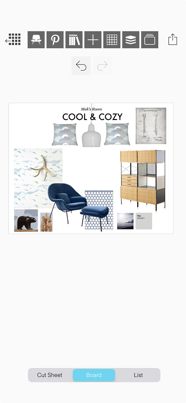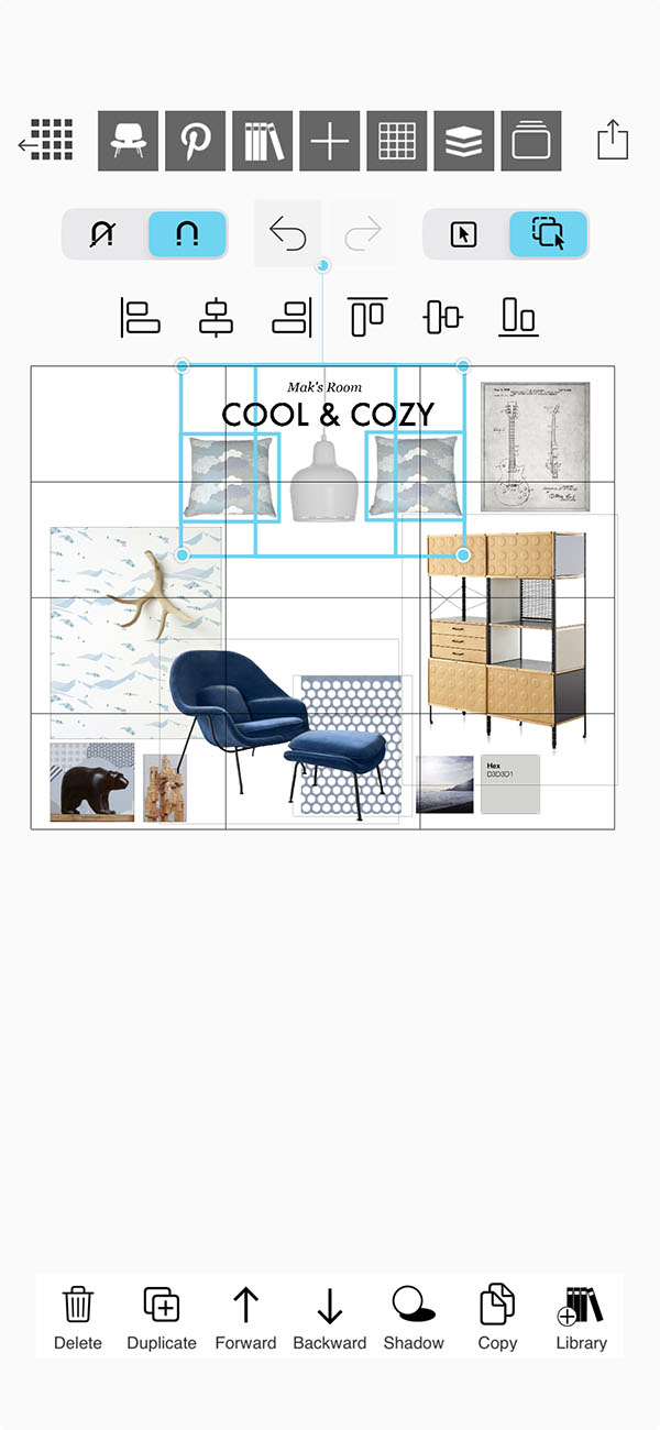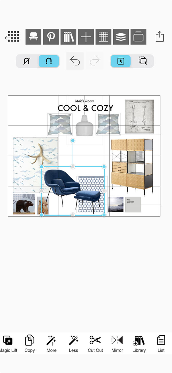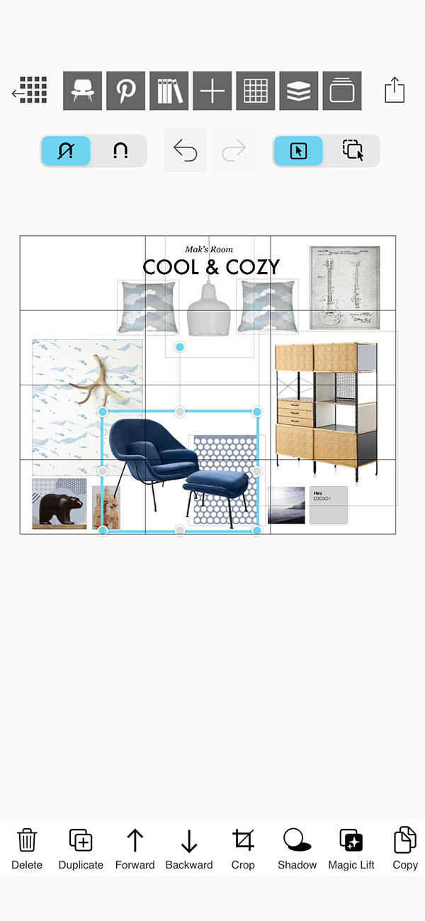 Your moodboard super tools will help you organize, edit, and arrange the images you add to your interior design moodboard or creative collage.
