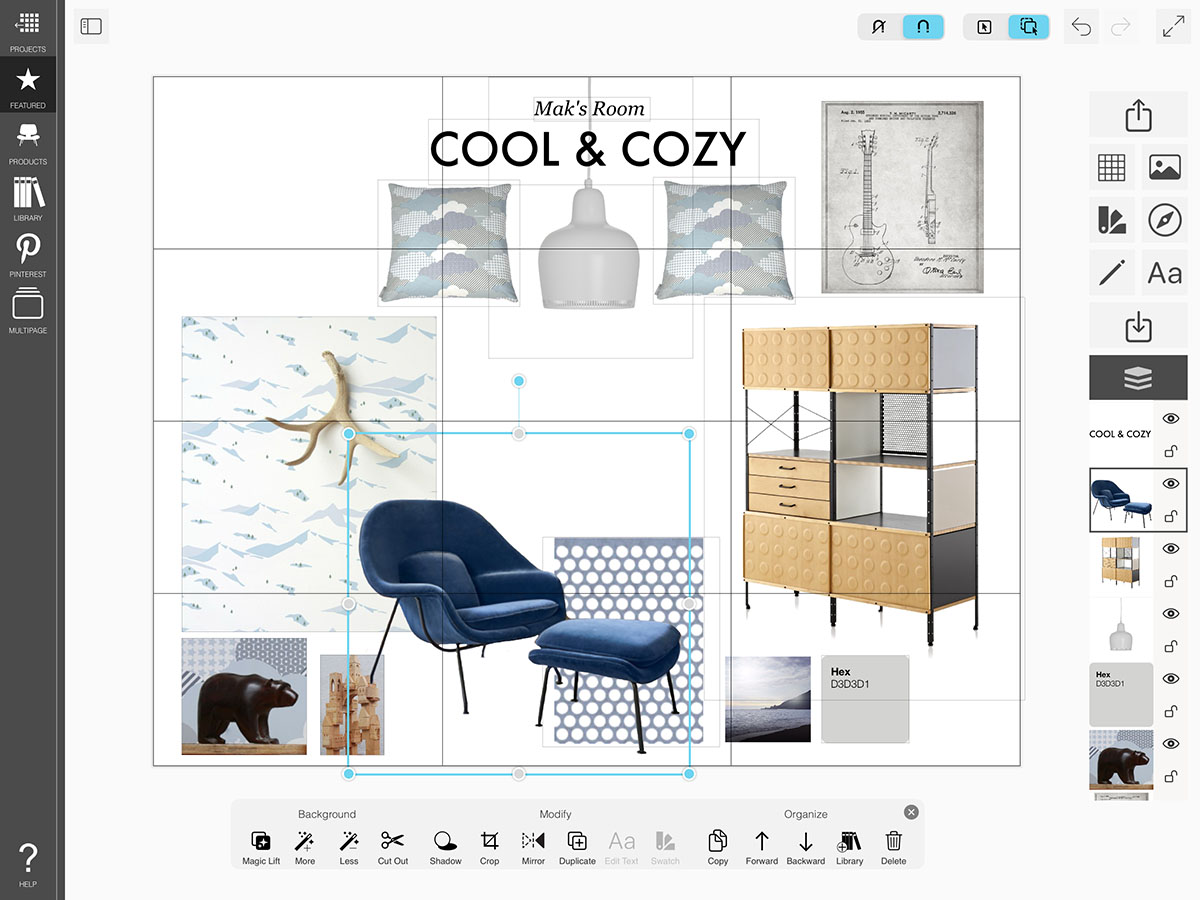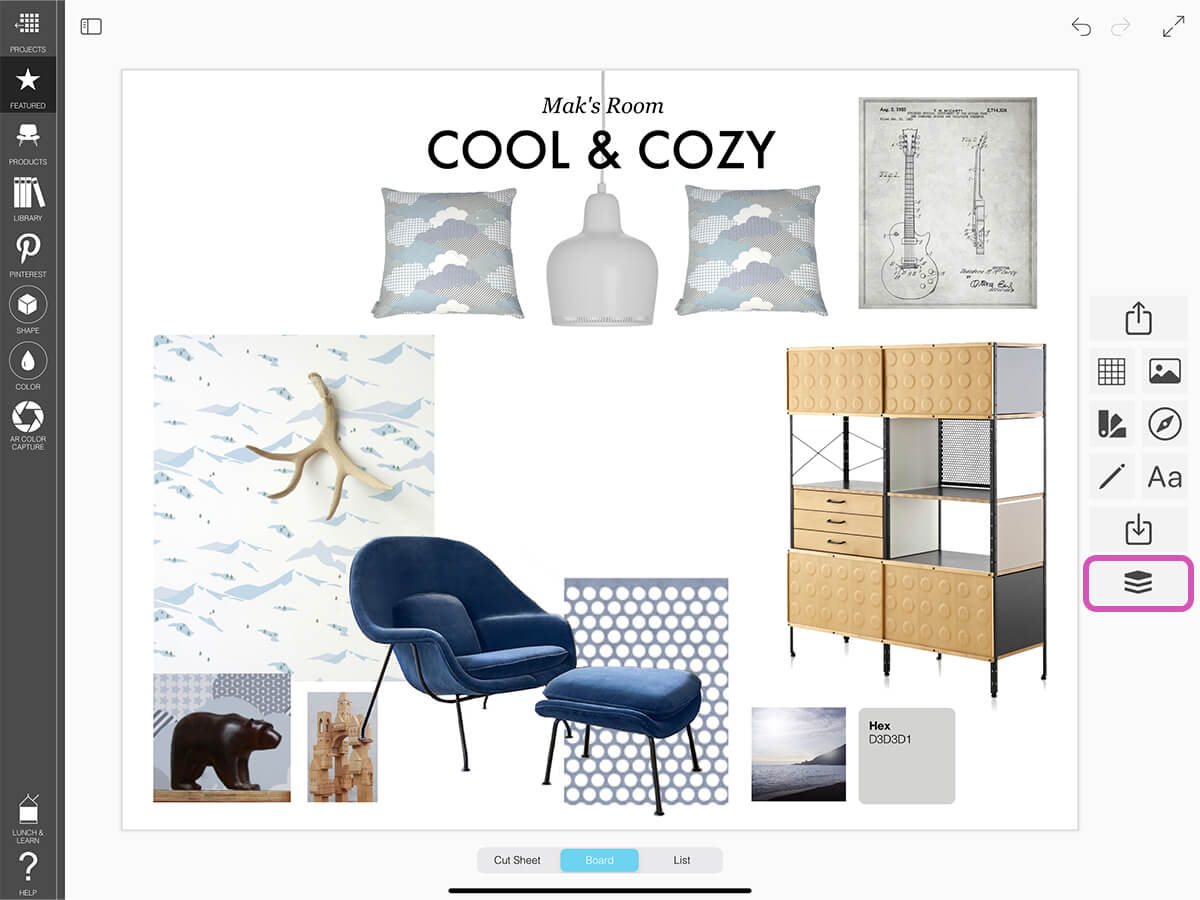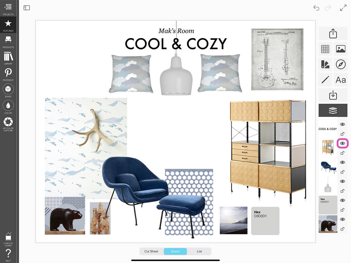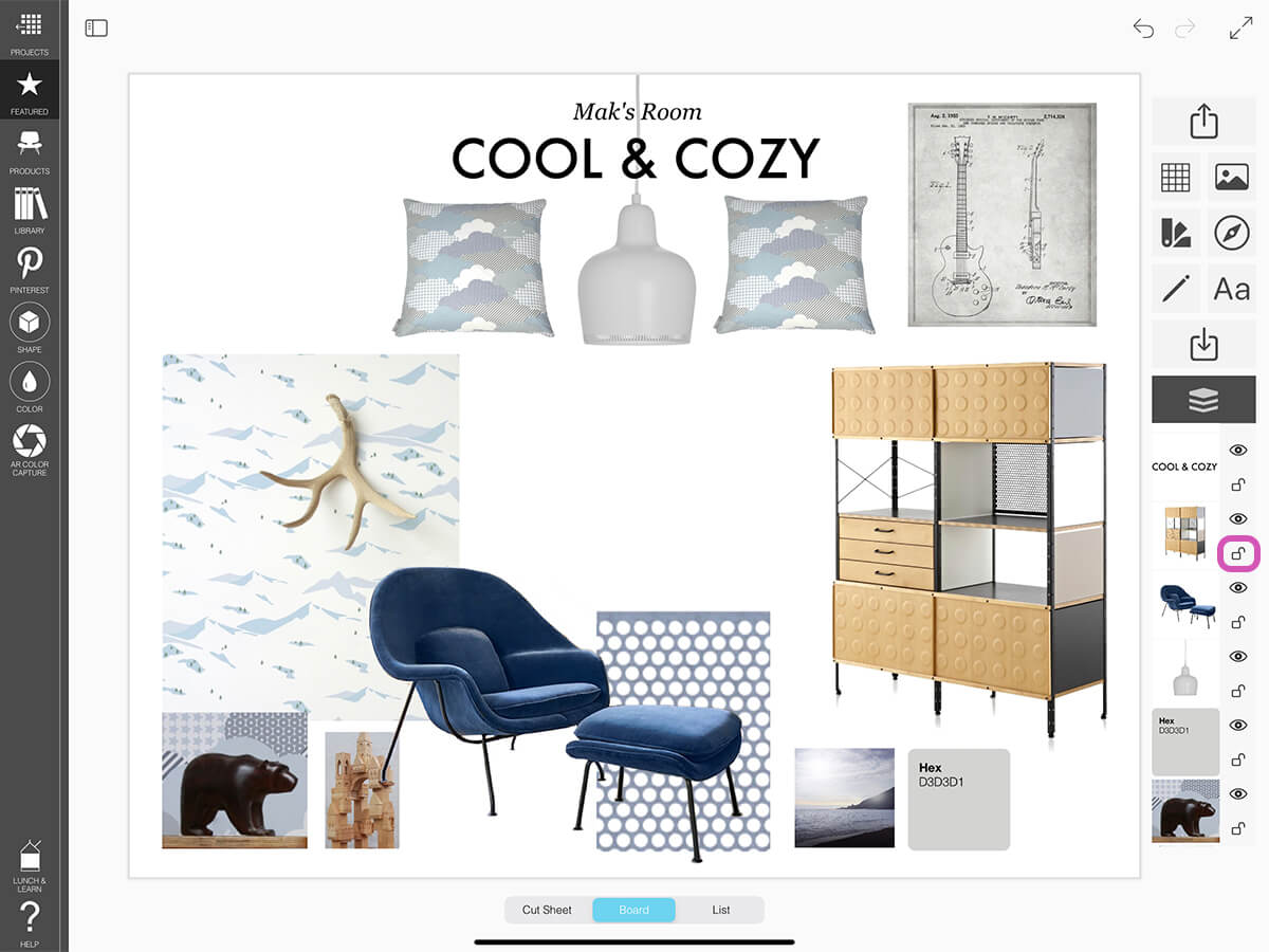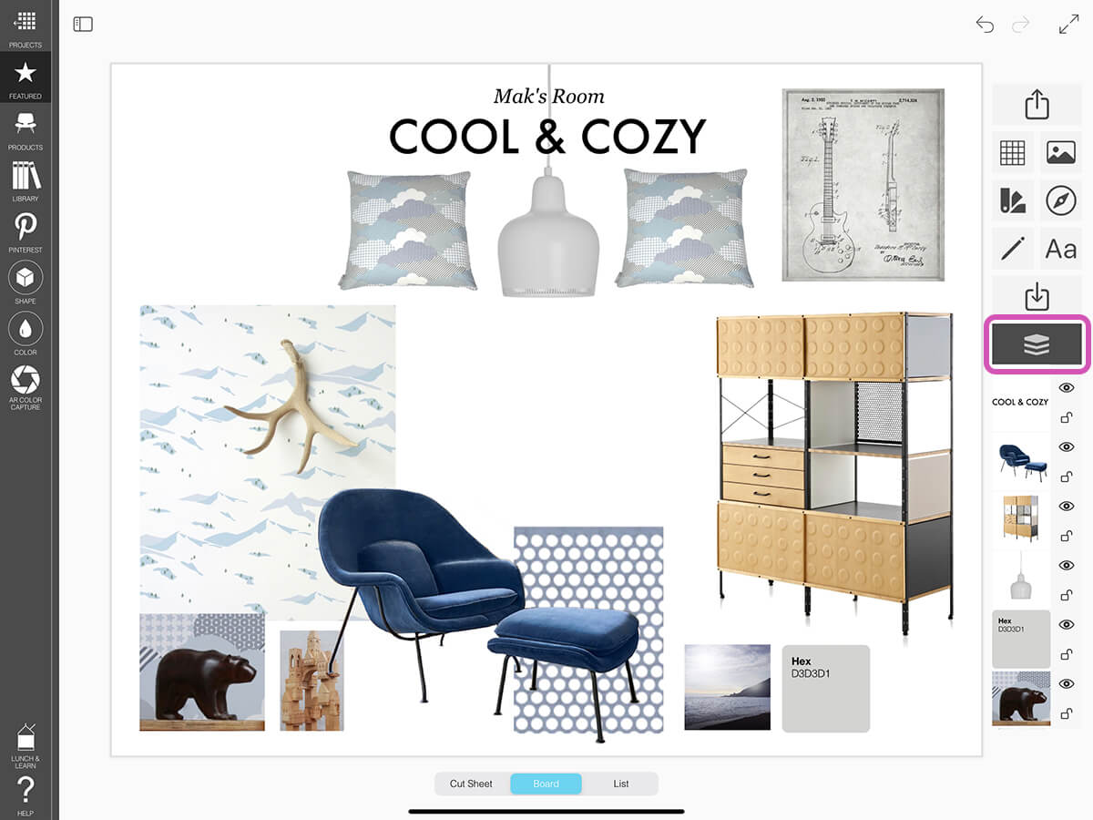 The image layers in Board are so easy to use–one of the many reasons that Board is the best app for interior designers. Every image or text box on your board is organized in your layer stack.