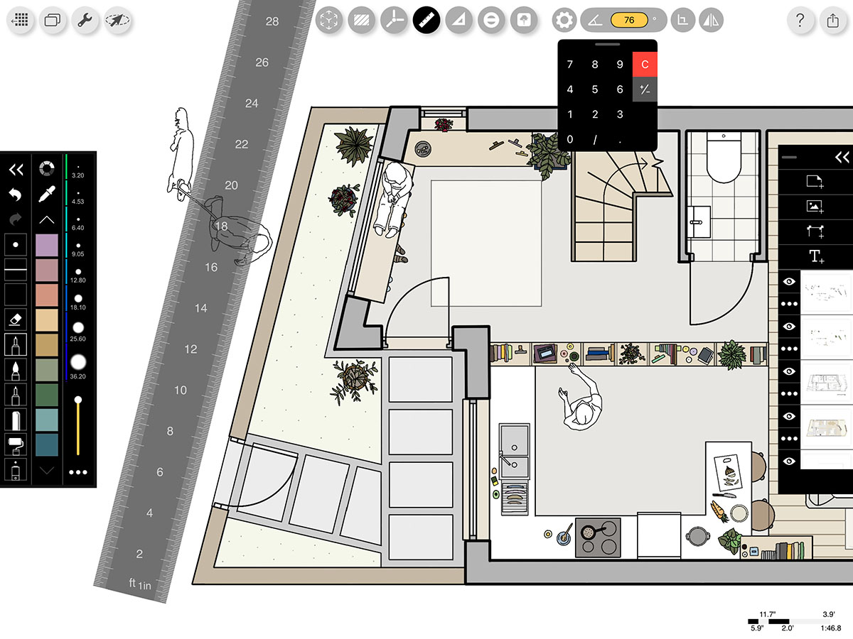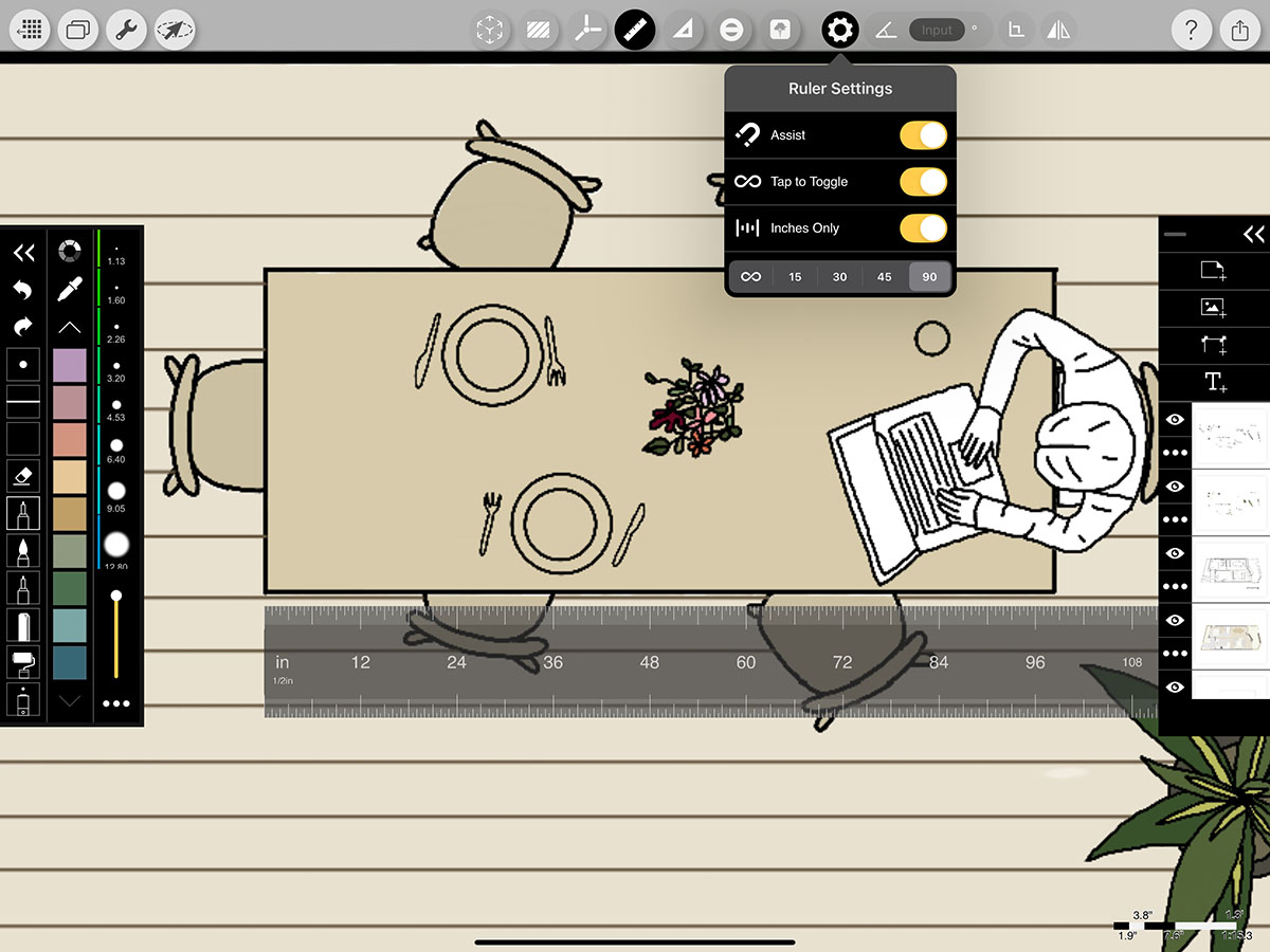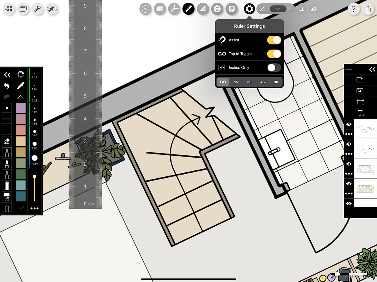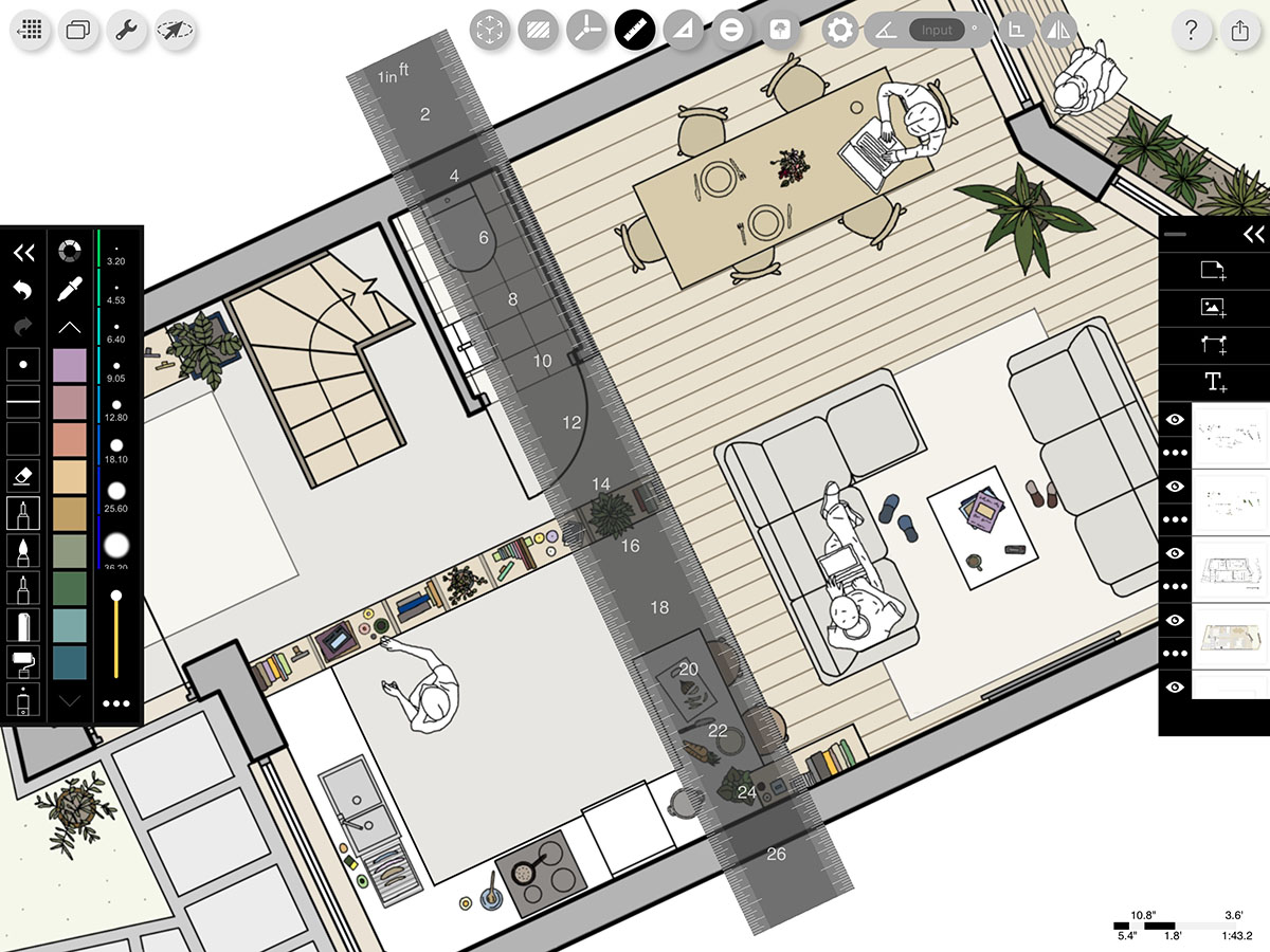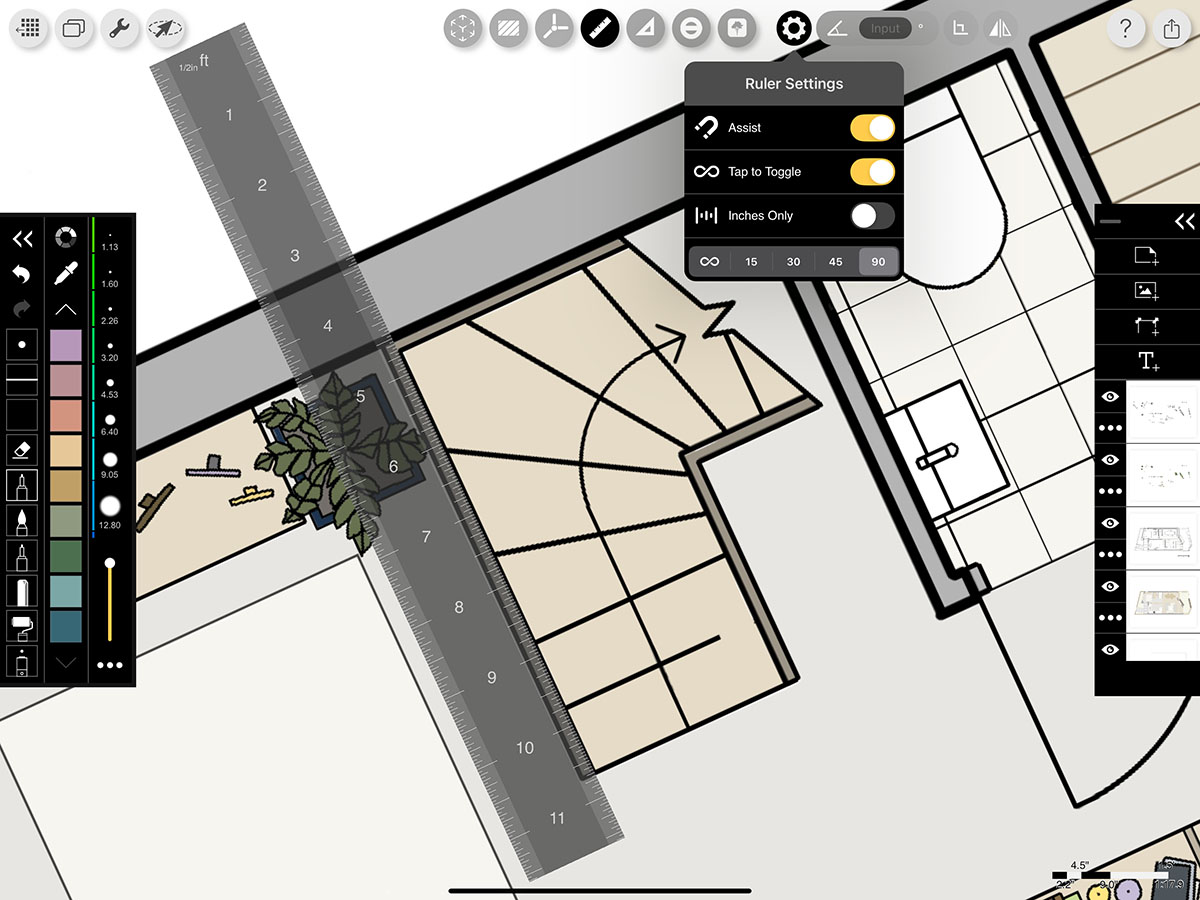 A scale tool or ruler is an essential tool for design. Morpholio has supercharged this tool for the best drawing app for iPad, transforming it into a Super Ruler for drawing accurate, straight lines, at the angle of your choice...or at any angle!