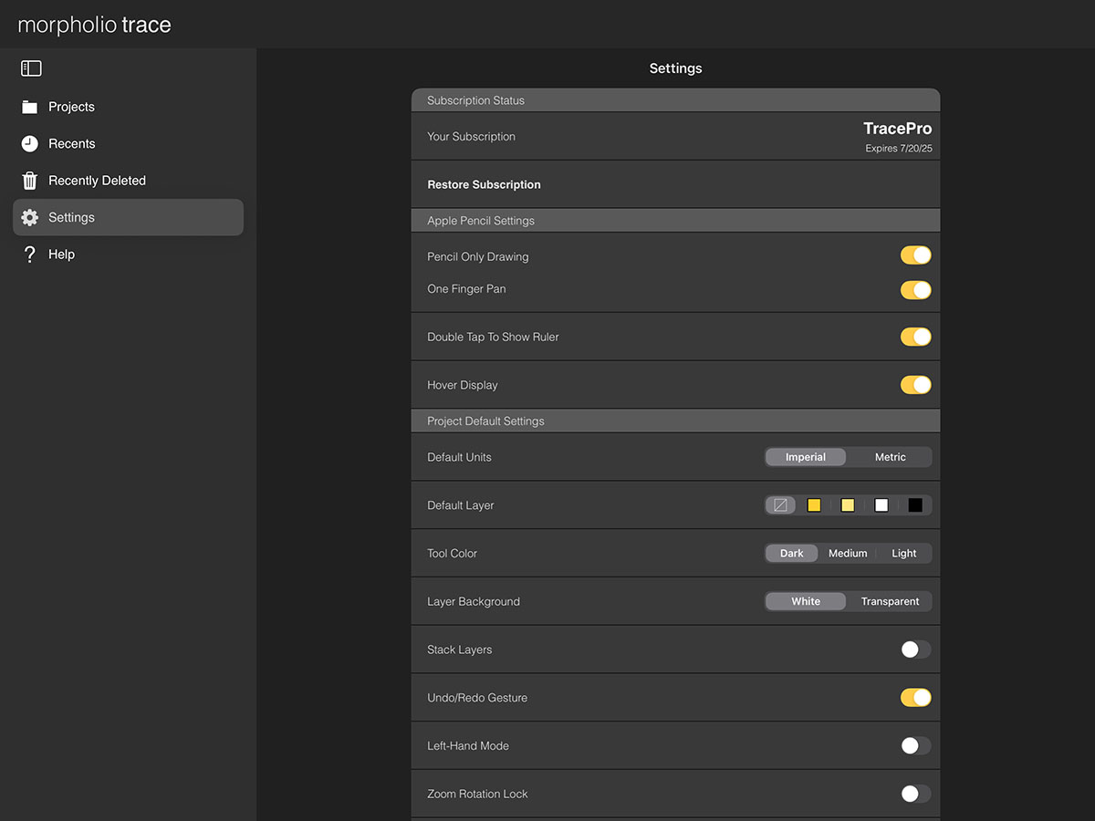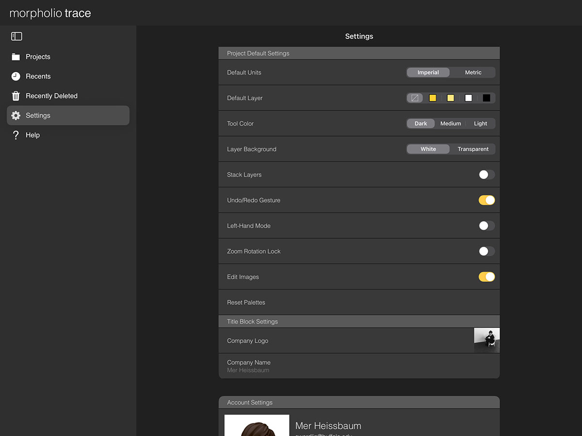 Your settings help you configure your default workspace. Once you have the perfect setup, you can always come back to adjust the details. These pro settings help make Trace the best app for architecture.