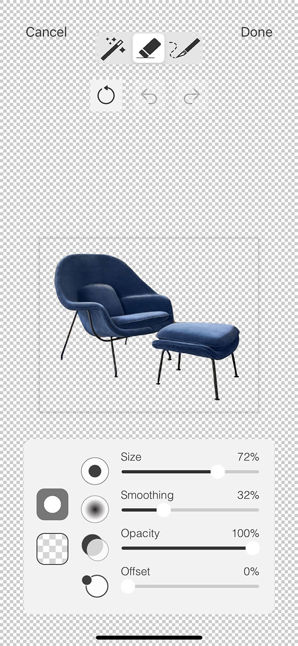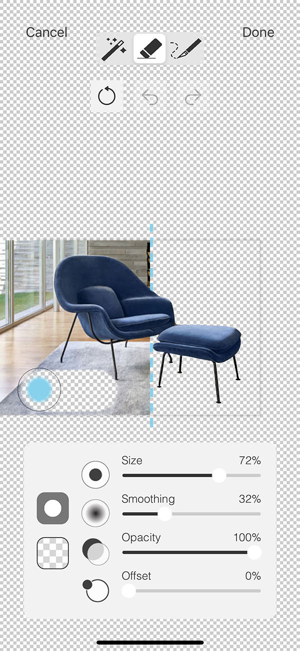 Start with a big eraser size to remove large portions of the image from a zoomed-out view. Then reduce the size of your eraser and zoom in to finish erasing to the edge of your product or furniture.
