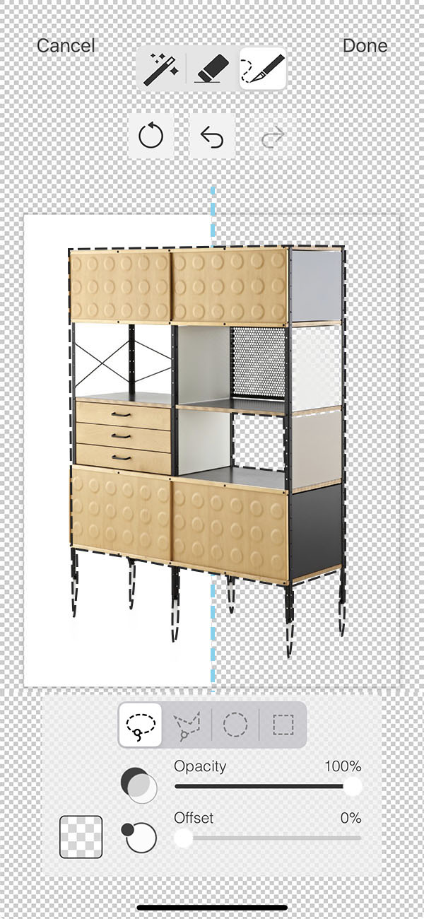 For bolder moves, use the magic knife to select large areas of an image to subtract. The knife works great for clipping unwanted shadows or use it to quickly pull an item out of a scene. You can pick between Freehand Lasso, Poly Lasso, Circle or Rectangle for how you'd like to cut out. You can also adjust the Opacity of your cut outs.