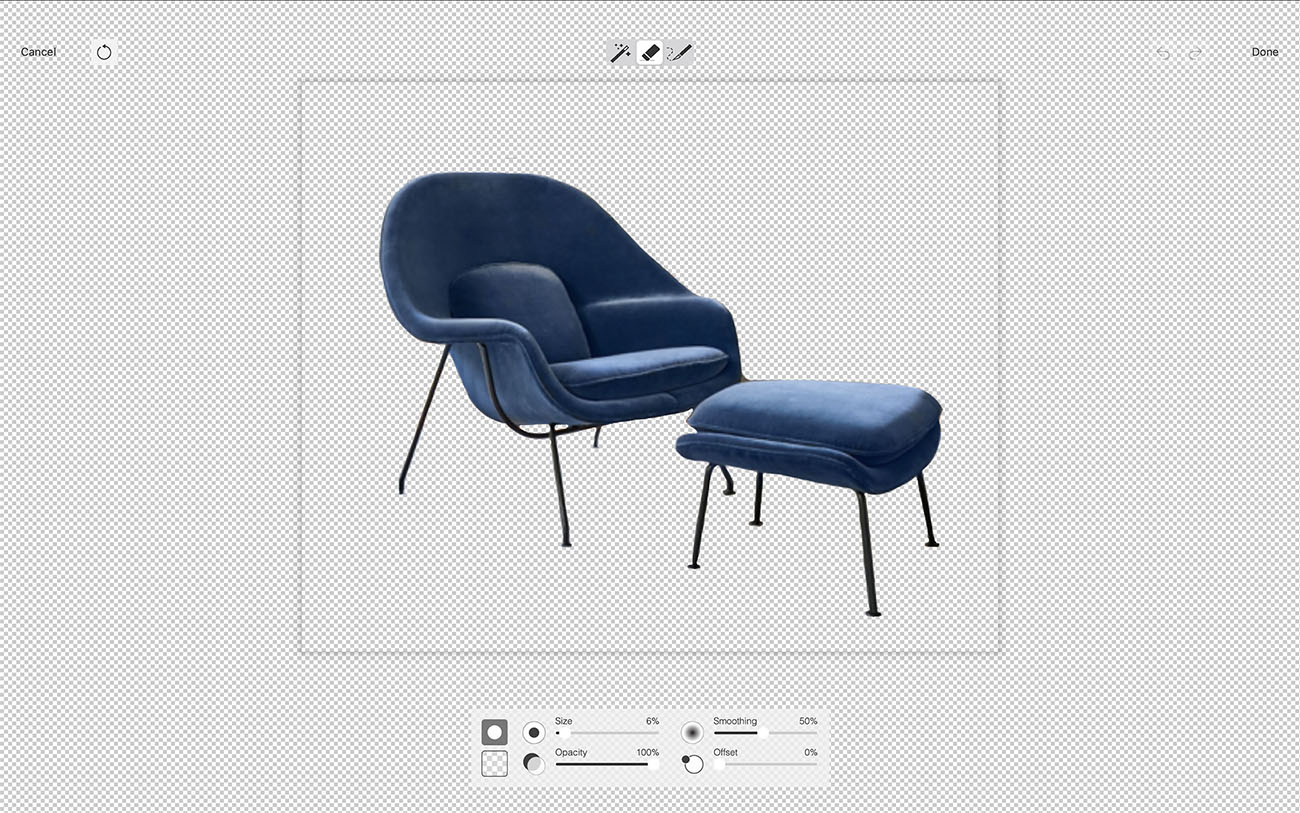 Simply click and drag with one finger to cut out an image. The knife works great for clipping unwanted shadows or use it to quickly pull an item out of a scene. Adjust your Opacity to set your knife.
