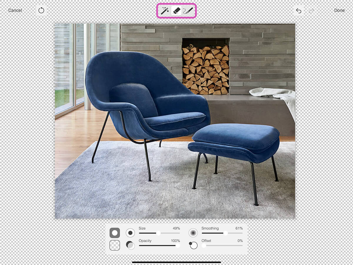 The new eraser will allow you to sweep away unwanted items in any photo and zoom in to perfect the details. Tap the Shape button to switch your brush between square and circle. Adjust your Size, Smoothing, and Opacity sliders to set your brush. If you're using your finger, adjust the Offset slider so you can see your brush as you move your finger over the screen.