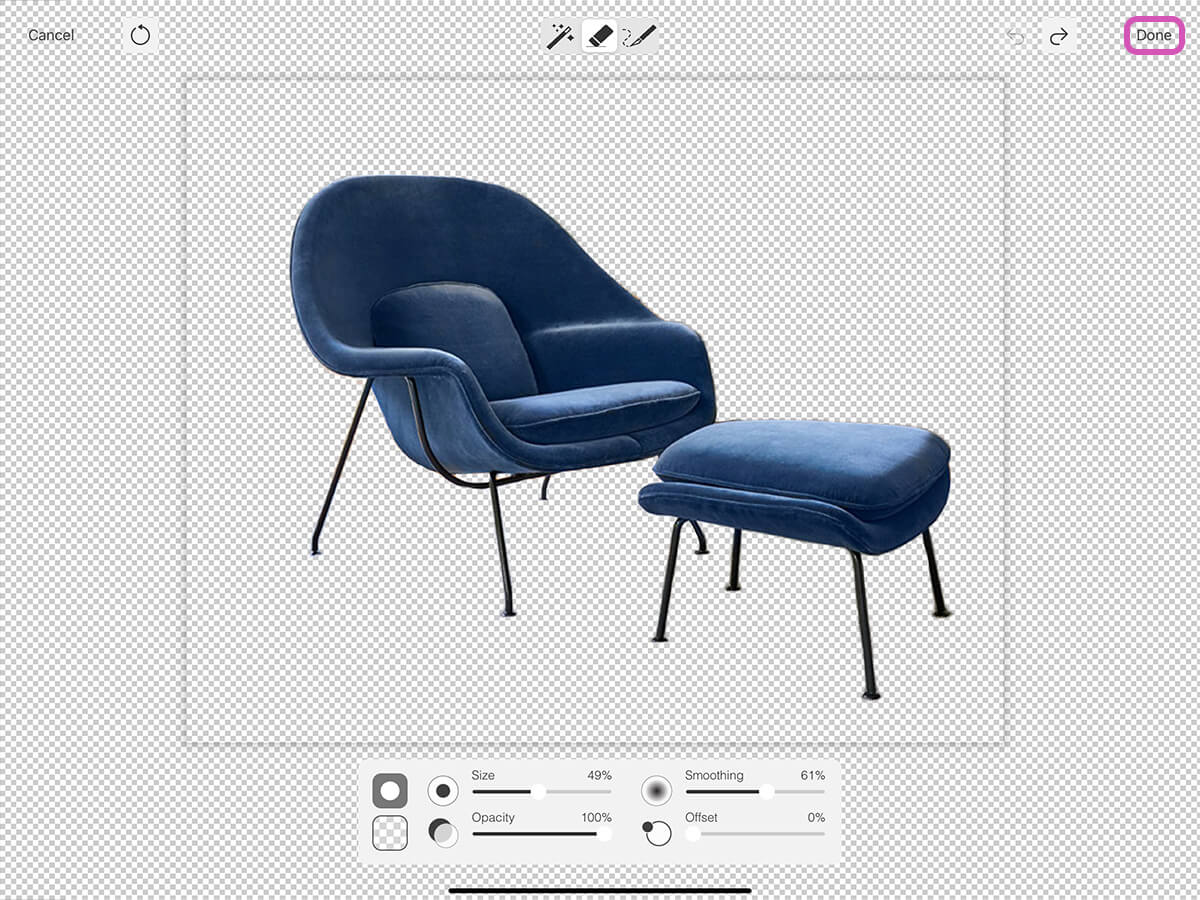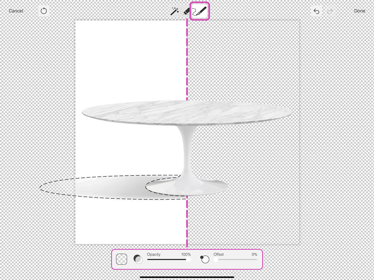 For bolder moves, use the magic knife to select large areas of an image to subtract. The knife works great for clipping unwanted shadows or use it to quickly pull an item out of a scene. Adjust your Opacity to set your knife.