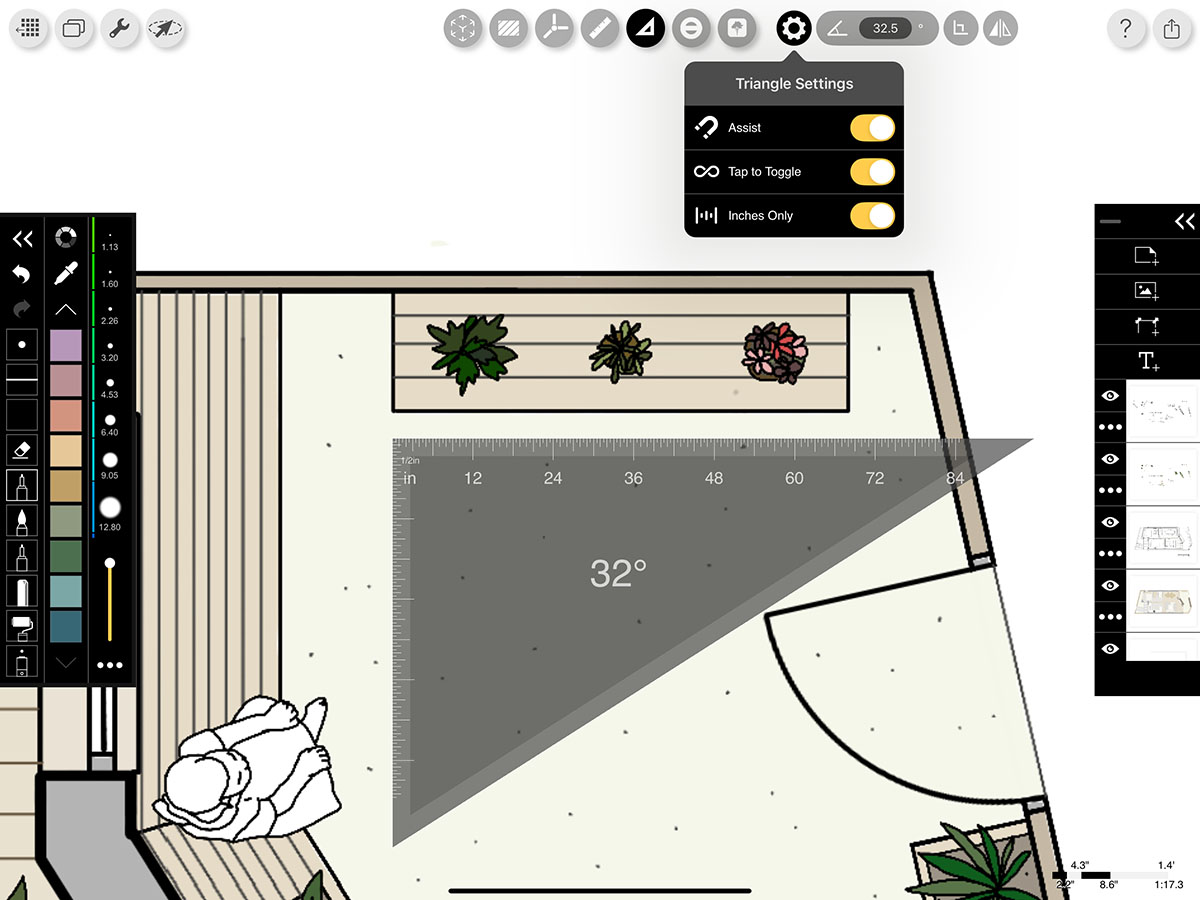 Tap the Super Triangle button to turn on the Super Triangle. You can use this tool to draw straight lines along the edge. You can also measure distances with the triangle edge. When you zoom in and out, you'll see that the units adjust to give you the best measurements at any view.
