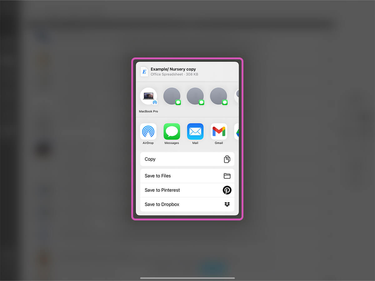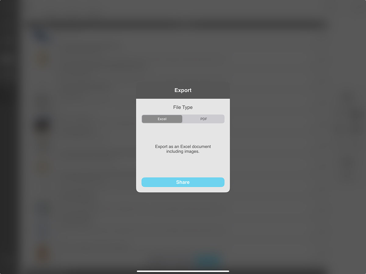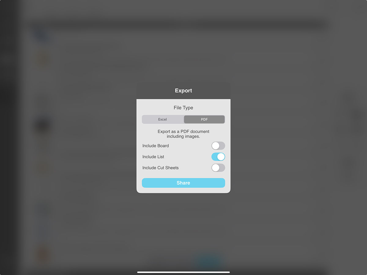 Tap the Export button on the board toolbar and then "Share" to share your product list excel file.