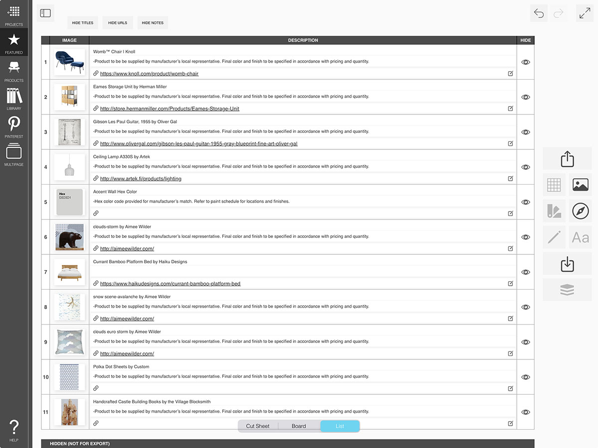 As you create your beautiful moodboard or creative collage, Morpholio Board is working behind the scenes to make a product list with all of the products on your board. When you're ready, you can share your product or shopping list as an excel file with any collaborator or client.