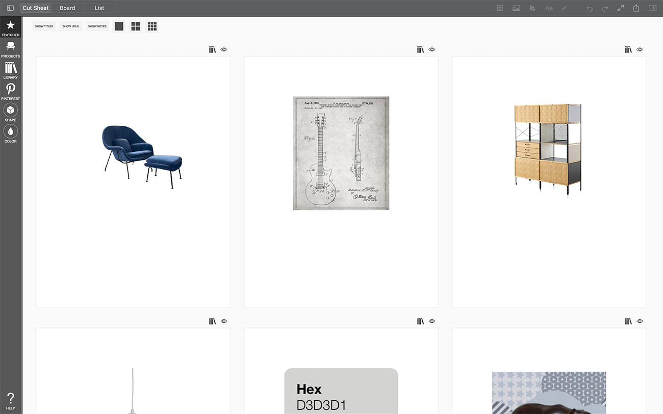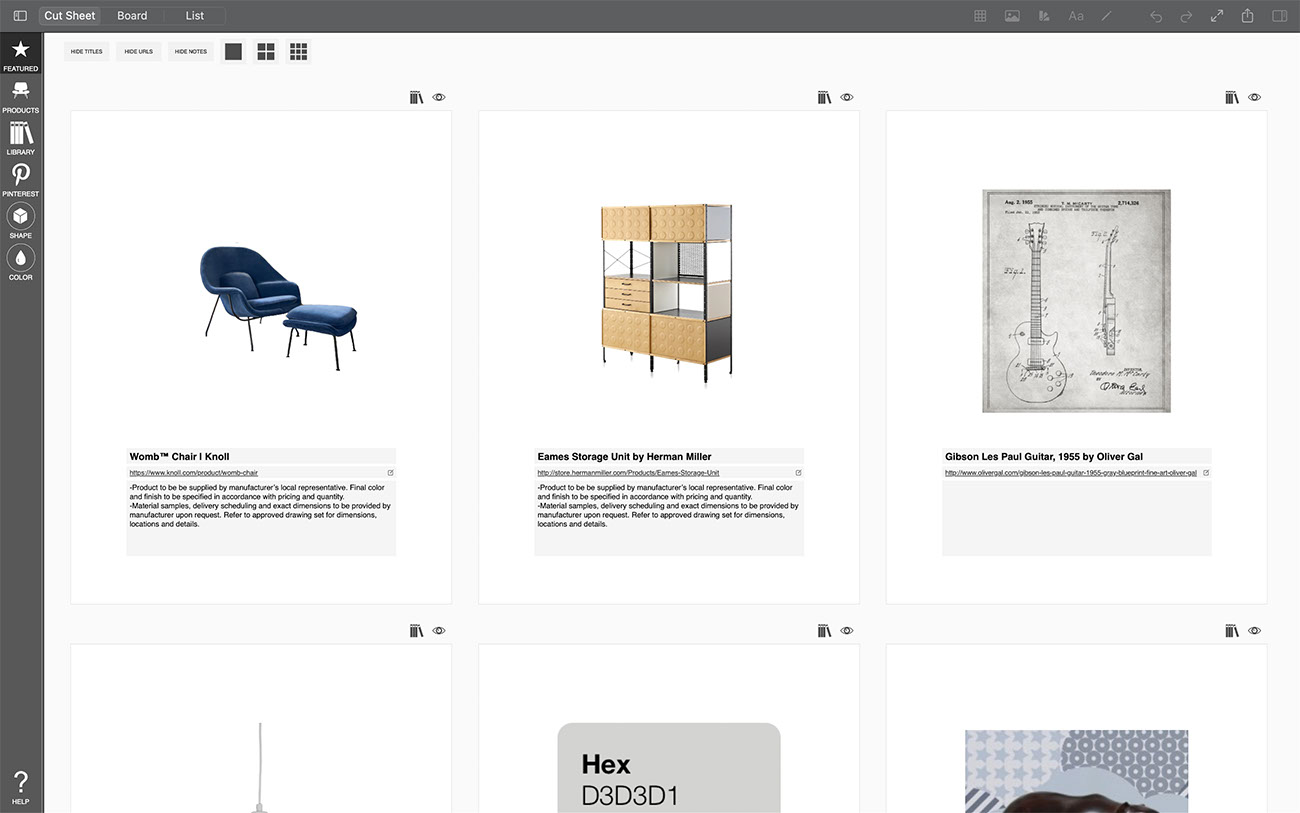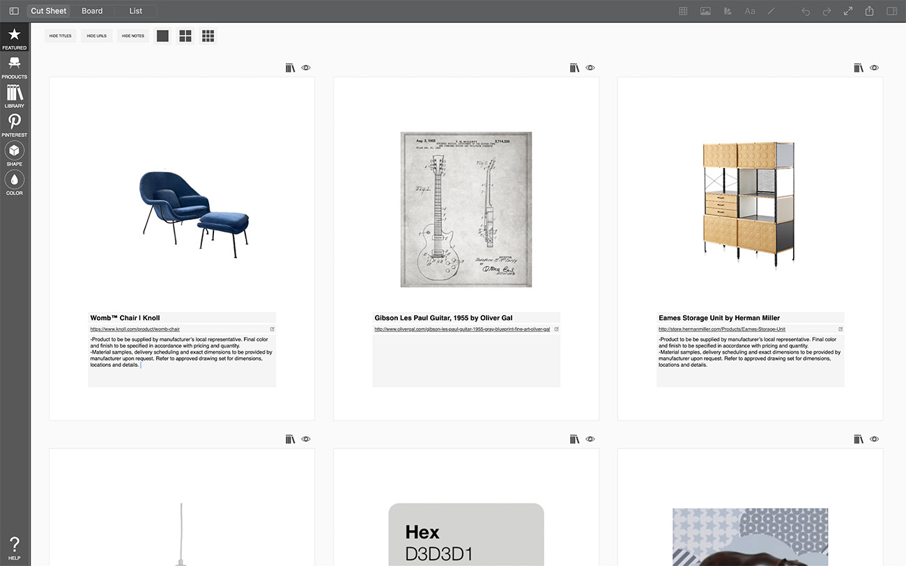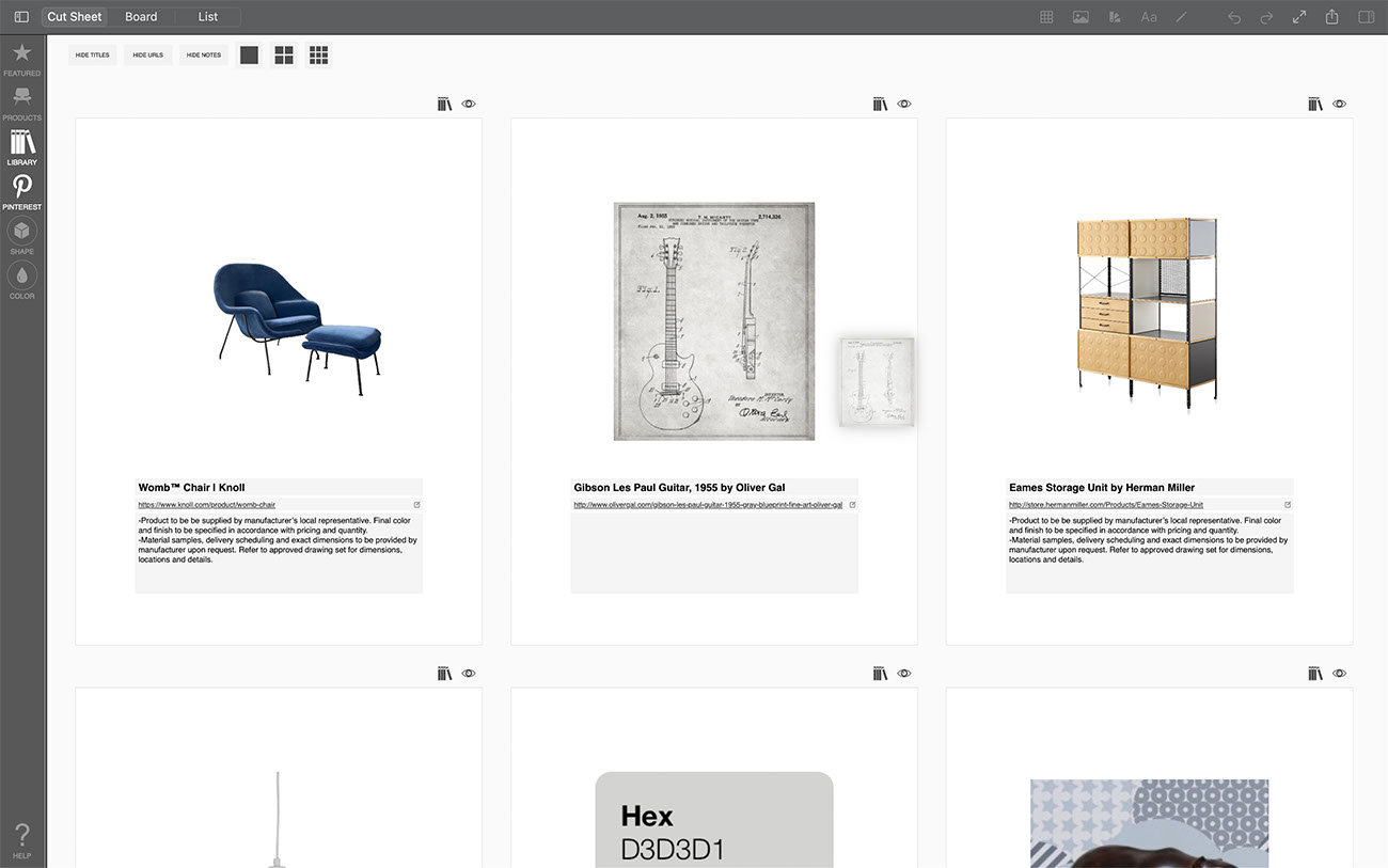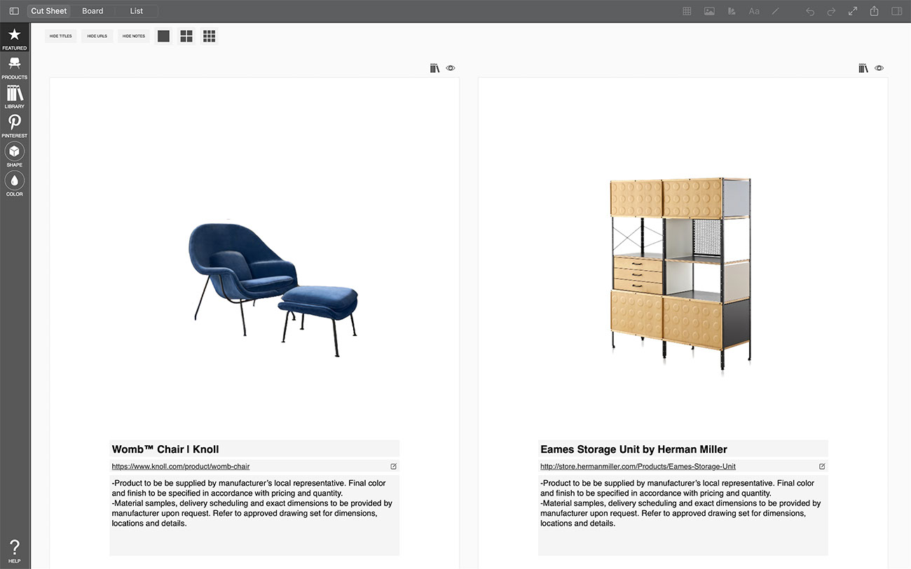 Cut sheets provide a great way to share details about each of the products added to your moodboard. This pro feature makes Morpholio Board the best app for interior design.