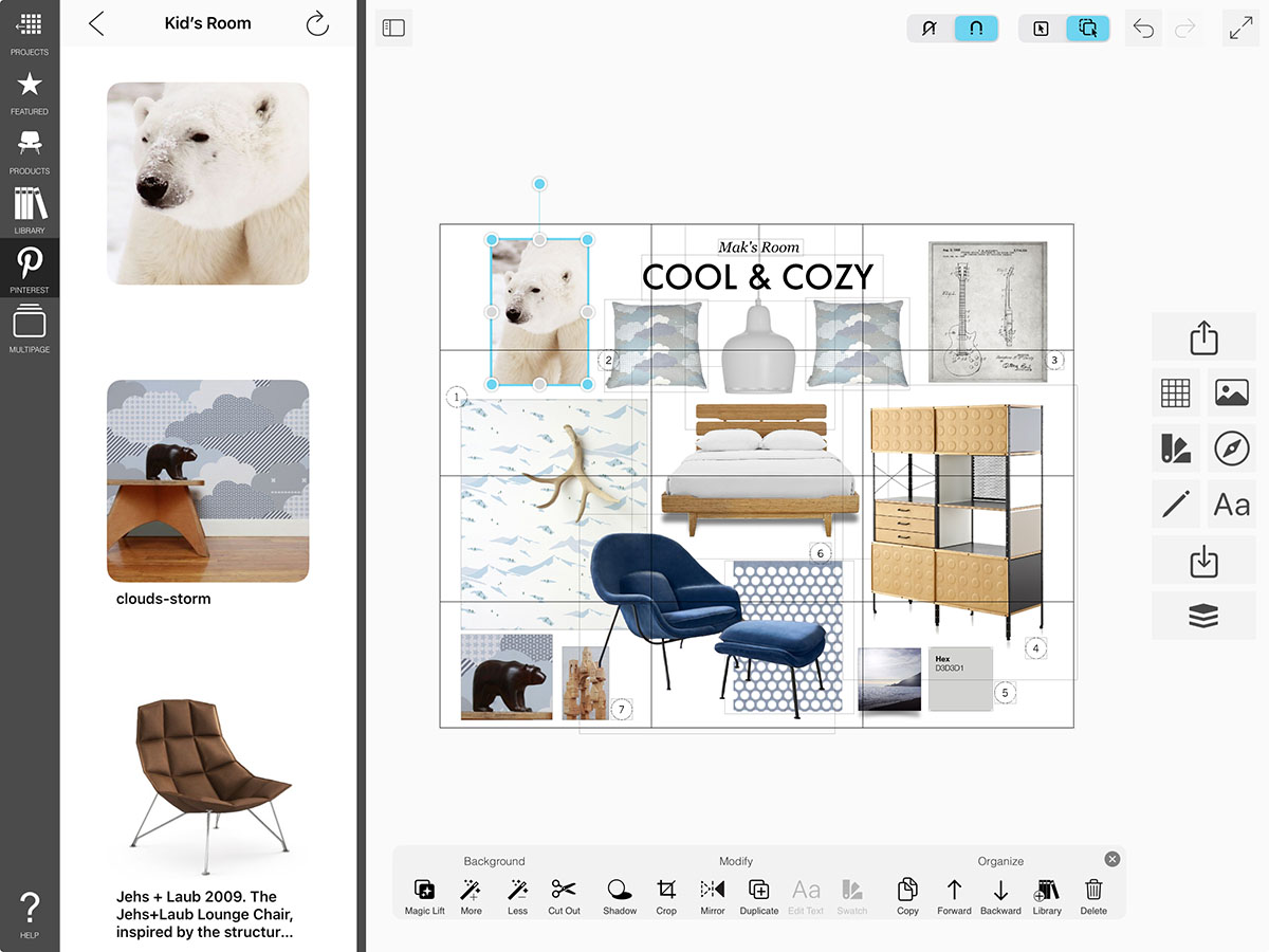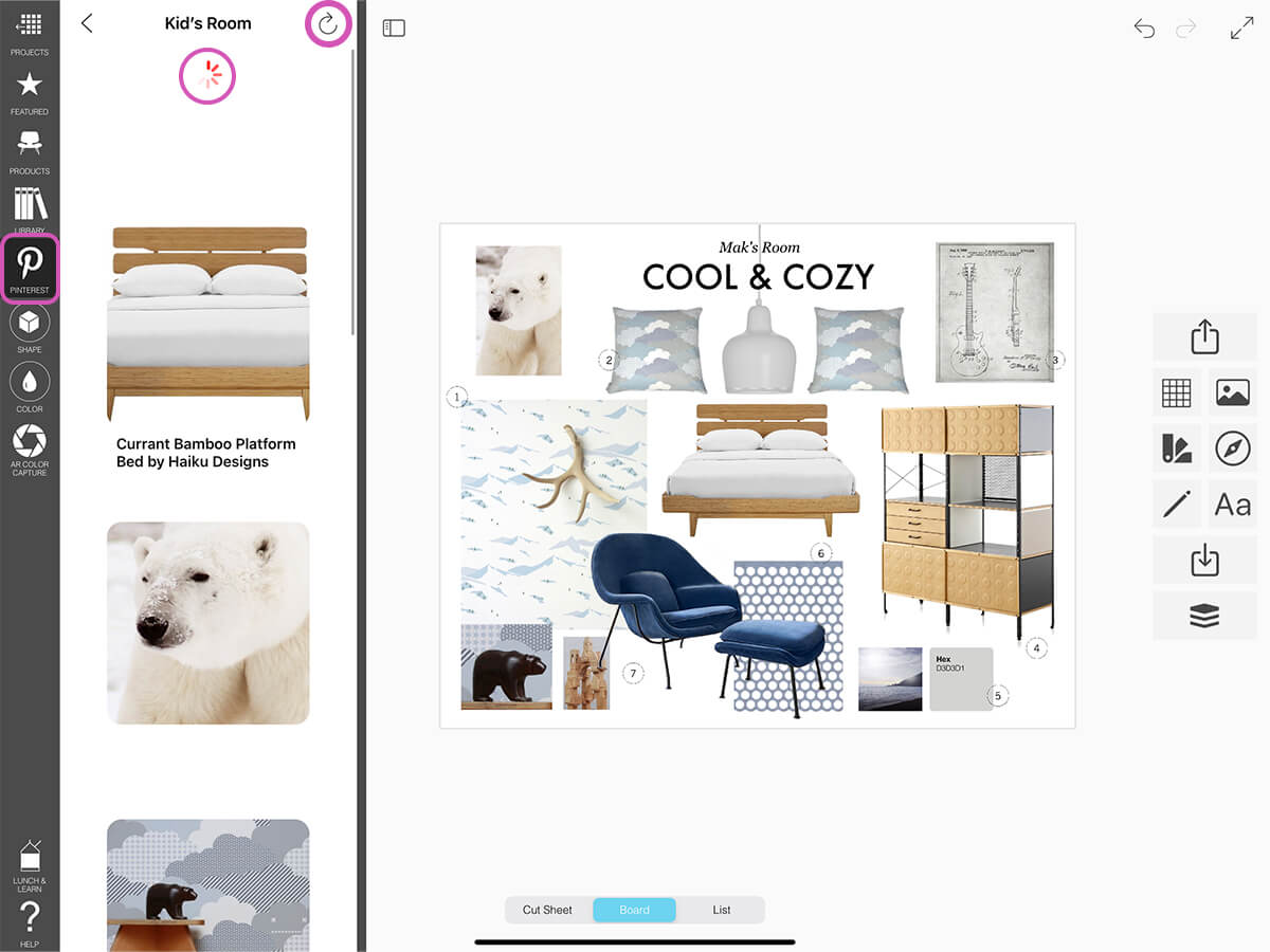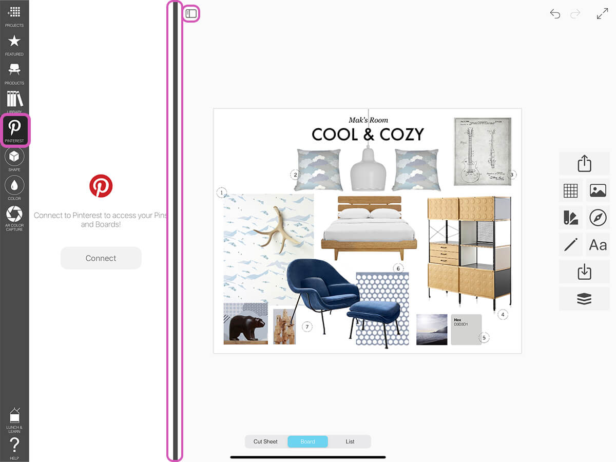 Pinterest is an essential tool for interior designers and creatives of all types. All of those inspirational images are just a tap away in your Pinterest Portal when you are moodboarding in Morpholio Board.