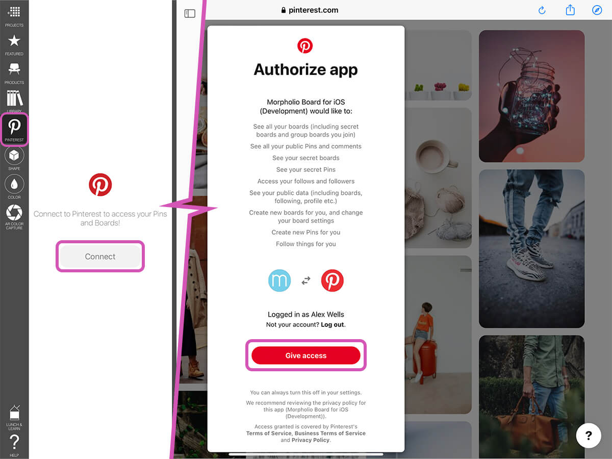 Tap "Connect" to log in to Pinterest using your account info. Then, tap "Give Access" to connect Morpholio Board to Pinterest and accept the terms.